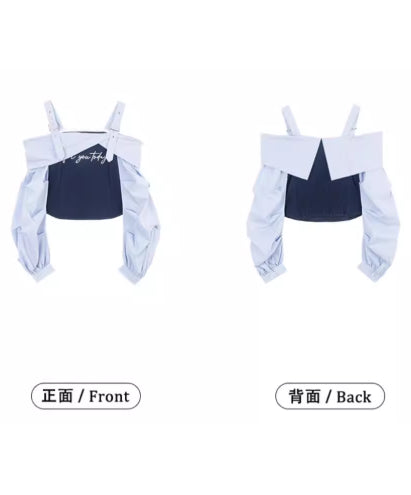 光沢感のあるネイビー×サックスブルーの配色が映える、ショルダーオープンデザインのブラウス。
